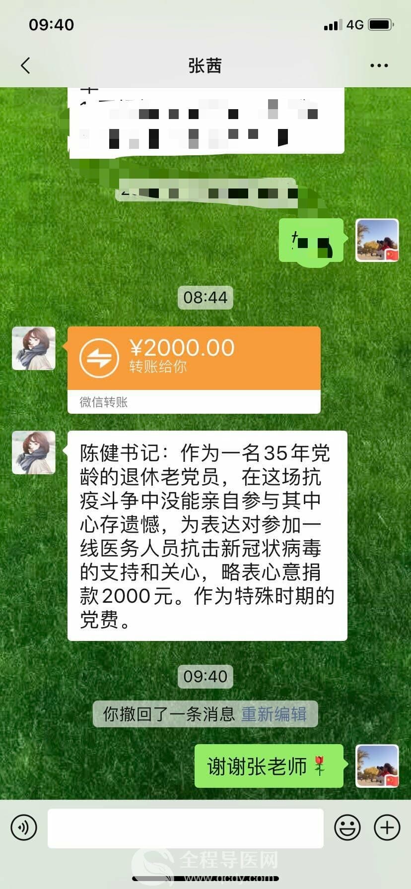 全程导医网 徐州健康:2月24日一大早,徐医附院第八总支书记陈健的微信收到一笔2000元的转账。原来这是第八总支党员张茜转来的一笔特殊党费。张茜老师的留言中写道,“作为一名35年党龄的退休老党员,在这场抗疫斗争中没能亲自参与其中心存遗憾,为表达对一线医务人员抗击新冠病毒的支持和关心,略表心意捐款2000元,作为特殊时期的党费。"这是张茜老师的肺腑之言。据悉,此笔特殊党费依据党章规定,已经在通过徐州医科大党委组织部转交至中央组织部的流程中。