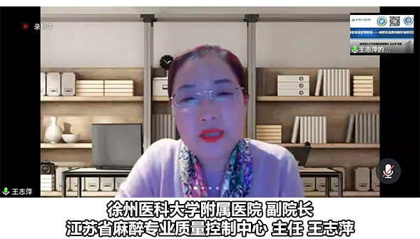 王志萍教授代表江苏省麻醉专业质量控制中心向线上参会的各位领导和专家致以热烈欢迎,介绍了2021年5月江苏省卫生健康委员会公布新一届省级各专业质控中心名单,徐医附院麻醉、急诊和整形外科专业都榜上有名,自己很荣幸担任新任江苏省麻醉专业质量控制中心主任,曾因明教授任名誉主任,希望可以同大家一起群策群力,携手并进,共同提升麻醉实力和核心竞争力,谱写江苏省麻醉专业质量控制中心建设发展新篇章。