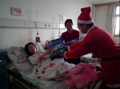 活动在悠扬的音乐声中开始,由输液室护士扮成圣诞老人向患儿招手,为患儿发放圣诞帽、毛绒玩具、勇敢小能手标志帖画等,同时还为患儿在圣诞老人面前合影留念,使得紧张的输液环境成为儿童乐园。恰巧一个在圣诞节过生日的患儿高兴的说:“今年的生日过的特别高兴,也特别有纪念意义,在儿童医院打针还收到了圣诞老人的祝福和礼物!太开心了!”