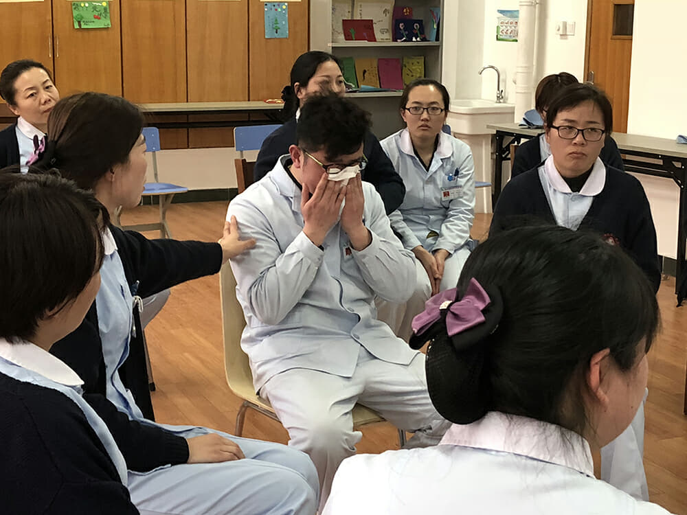 其形式体现在, 组员通过亲身经历的医患关系案例让其他成员分享自己的感受和想法,帮助当事人更好的理解患者,理解自己在医患关系中的作用,使案例提供者获得小组成员的理解和支持,对减轻一线医护工作者的心理负担有明显效果。