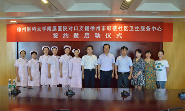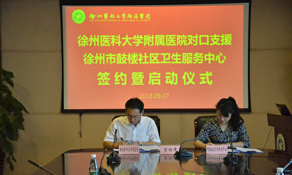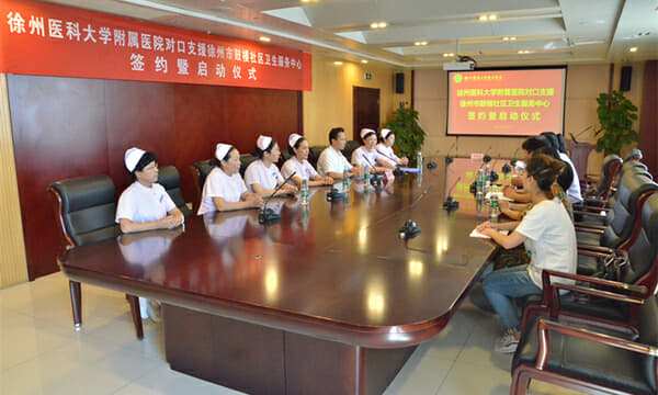 全程导医网 徐州卫生信息:为深入贯彻落实党的十九大精神,按照徐州市卫计委落实二级以上公立医院对口支援基层医疗卫生机构护理工作的要求,9月7日下午,“徐州医科大学附属医院对口支援徐州市鼓楼社区卫生服务中心签约暨启动仪式”在徐医附院新大楼21楼第三会议室举行。徐医附院副院长金培生、护理部主任刘玉平、副主任张梅、王晶、支援专家郑轩及各大科护士长,徐州市鼓楼康复医院院长董瑞国、副院长赵艳春,徐州市鼓楼社区卫生服务中心副主任兼护理部主任时孝丽及部分科室负责人参加了此次仪式。签约仪式由护理部刘玉平主任主持。