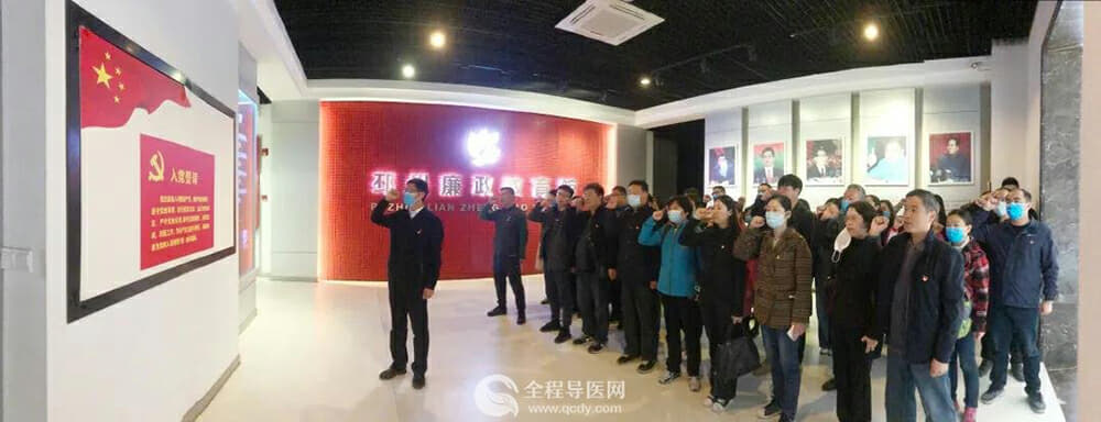 在展厅对面的廉政教育馆,面向鲜红的党旗,在张洪永书记的带领下,大家举起右手,重温入党誓词,一字一句,声音洪亮,慷慨激昂,表达了为党的事业奋斗终身的坚定信念与决心。