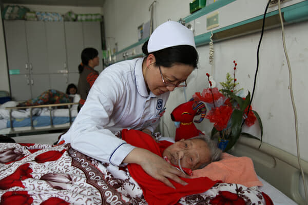 我母亲在老年科住院的日子里,崔护士长每天带着可爱的天使们来到母亲身边,亲切的询问病情,查看病人,时刻关心着母亲的病情。外面虽然是寒冷的冬天,但我们这些做儿女的心里却感觉暖暖的。母亲住院期间被下过几次病危通知书,抢救过好几次,是他们一次次把我母亲从死亡的边缘拉回来。97岁的母亲身体瘦弱,相信在老年科没有比她的血管再难打的了,但每次输液时她们都是耐心、仔细,一针见血。记得有次夜里,母亲病情突然又加重了,只见郑娜很敏捷的一针打上了留置针,及时用药,使母亲转危为安。母亲鼻腔插着胃管,每天看到孙亚、赵双、王丽娜等美女小护士们娴熟地为母亲喂饭,做口腔护理、会阴护理等,从不嫌脏怕累。她们是那样的温柔可亲,善良而又贤惠。深夜在大家安静入睡的时候,又是值夜班的护士们一次次的来到母亲身边,时刻观察母亲的病情,为她盖好被子,轻轻的对她说:“杨奶奶,安心睡吧,请您放心,我们时刻守护着您。”多么简短的一句话,让我们家属心里暖暖的,感觉这个冬天不再寒冷。谢谢你们,李荣、王菲、曹伟艳、赵金巧这些年轻又漂亮的护士们,你们就像我自己的孩子,亲切又温柔。