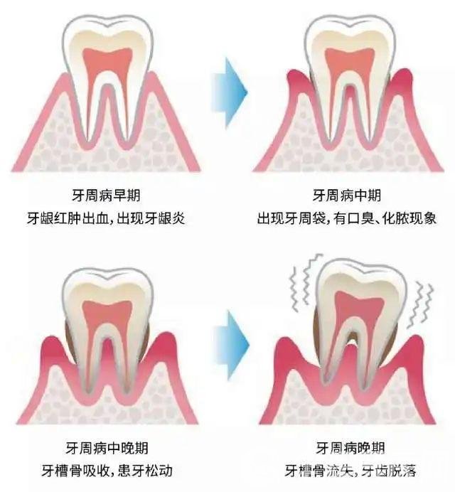 临床表现:牙龈炎症、出血、牙周袋形成、牙槽骨吸收、牙齿松动移位、咀嚼无力,严重者牙齿可自行脱落或导致牙齿的拔除。