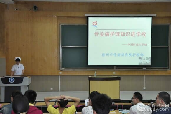 全程导医网 徐这传染病医院/传染频道:为提高高校大学生的健康意识,普及常见传染病防治及护理相关知识,传播健康理念,徐州市传染病医院医护健康教育小组一行8人分别于5月8日及14日上午前往江苏省师范大学及中国矿业大学开展“健康中国,科普助力”传染病科普宣传进学校、“健康大讲堂”等系列宣传活动。两所院校近五百余名大学生参与此项活动,并认真聆听了专题讲座。