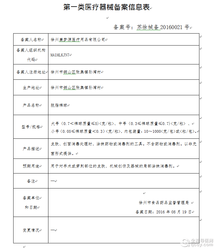 根据国务院《医疗器械监督管理条例》及国家食品药品监督管理总局《关于第一类医疗器械备案有关事项的公告》规定,经审查,徐州康梦源医疗用品有限公司申请的脱脂棉球符合备案要求,现将备案信息表予以公示,请社会各界监督。