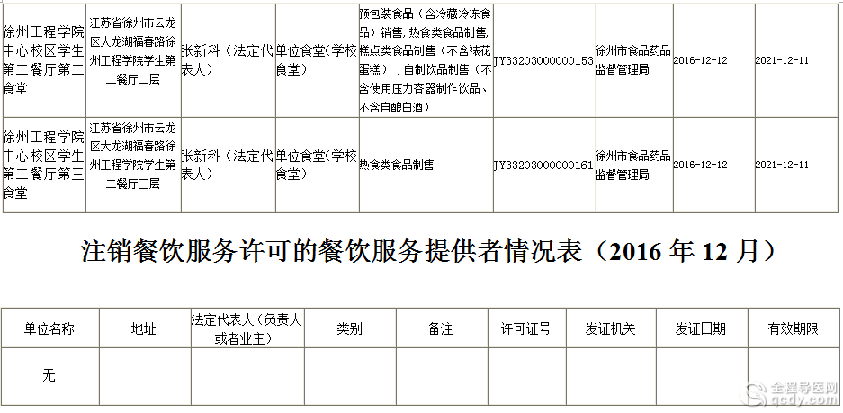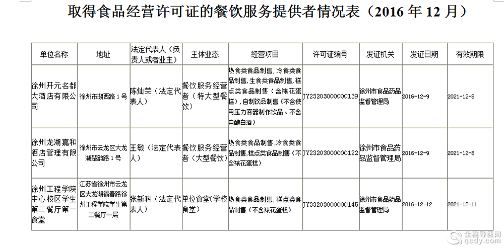 徐州食品经营许可(餐饮服务类)情况公示(2016.12)