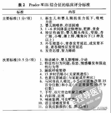 中国儿童的PWS临床特征与国外不尽相同。目前国际上通行的PWS临床评分标准包括6条主要标准、11条次要标准和8条支持证据。年龄<3岁总评分5分以上,主要诊断标准达4分即可诊断;年龄≥3岁总评分8分以上,主要诊断标准达5分即可诊断。
