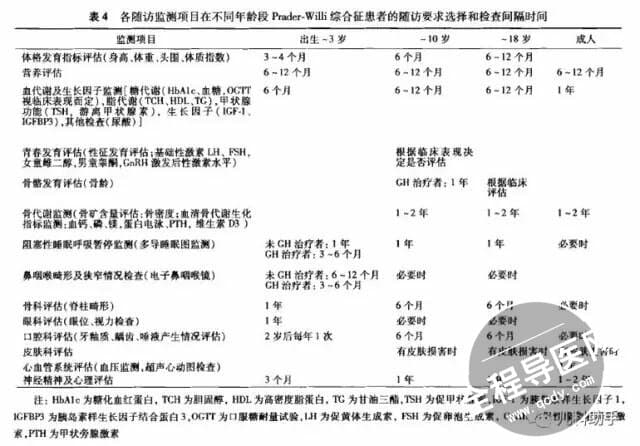 不同年龄段PWS患儿的随访指标包括体格发育、营养状况、青春发育、神经精神状况等的评估,也包括血生化指标、骨龄、骨密度、脊柱x线片等的监测,应定期进行随访观察。