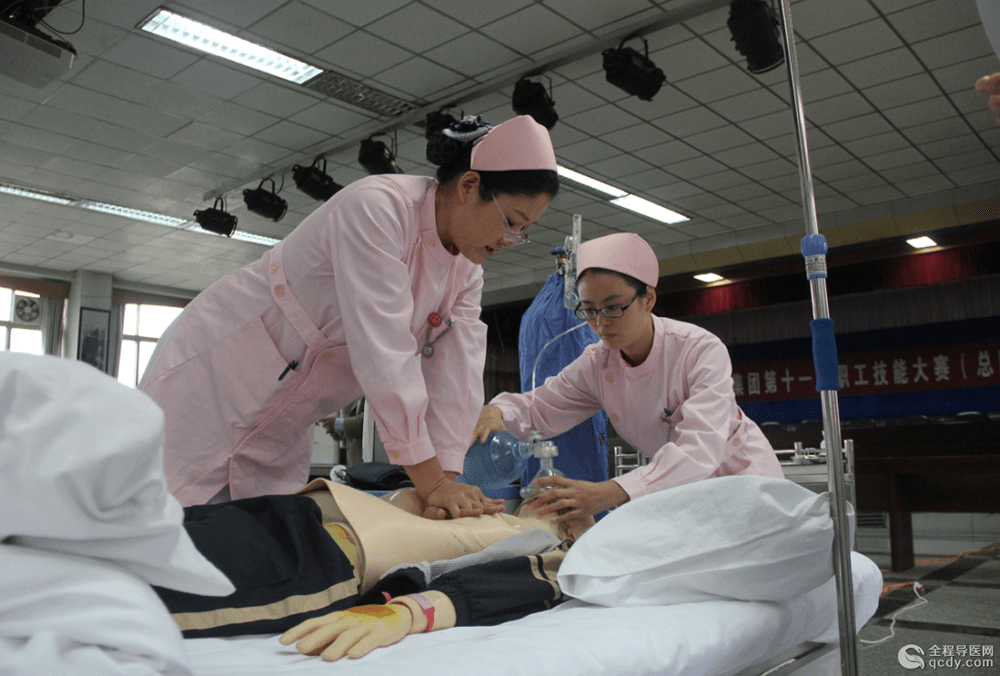 一人取出呼吸器、氧气、心电监护仪,并将之一一备好;一人立刻清除患者口腔气道的分泌物,检查颈动脉搏动,进行心肺复苏急救。听到复苏成功指令后,撤去呼吸器,连接氧气管,进行输液,穿刺,打开监护仪,定位电极片,连接心电导联线,监测心电图……几十个流程,上百个操作要领,在短短5分钟左右,如行云流水般一气呵成。更让人难忘的,是护理人员一边操作,一边用亲切的话语安抚患者:“我们就在你身边,希望你放松心情,不舒服的时候马上按铃告诉我们。”这是10月15日上午11点,在徐矿总院赛区休克抢救赛场上记者看到的情景。