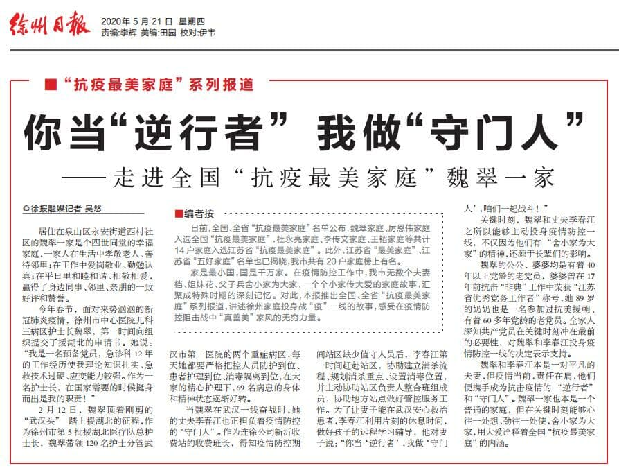 家是最小国,国是千万家。在疫情防控工作中,我市无数个夫妻档、姐妹花、父子兵舍小家为大家,一个个小家传大爱的家庭故事,汇聚成特殊时期的深刻记忆。对此,本报推出全国、全省“抗疫最美家庭”系列报道,讲述徐州家庭投身战“疫”一线的故事,感受在疫情防控阻击战中“真善美”家风的无穷力量。