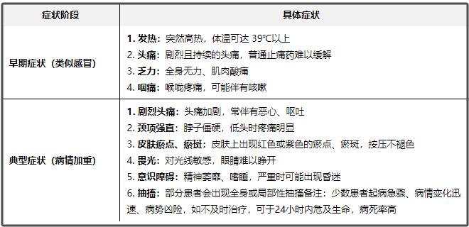 在高发季来临前,高风险人群也可考虑自费补充接种疫苗。在冬春季节一旦出现高热、头痛之后出现呕吐、皮肤大面积瘀点、瘀斑甚至意识混乱、嗜睡、昏迷等症状尽快就医,切勿拖延!!!