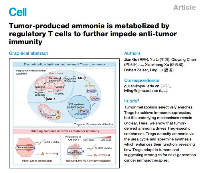 2025年12月24日,徐州医科大学附属医院吕凌教授团队联合南京医科大学第一附属医院在国际顶级期刊《Cell》正式发表“Tumor-produced ammonia is metabolized by regulatory T cells to further impede anti-tumor immunity”研究论文。该研究表明,肿瘤产生的氨会被调节性 T 细胞(Treg 细胞 )代谢,增强 Treg 细胞,从而进一步阻碍抗肿瘤免疫反应。该研究提示了将氨生成作为靶点能够抑制 Treg 细胞,从而为抗肿瘤免疫治疗提供了一种潜在新策略。这是徐州医科大学、徐州医科大学附属医院首次以第一完成单位在国际三大顶级学术杂志发表重大研究成果,实现了高水平论文重大突破。