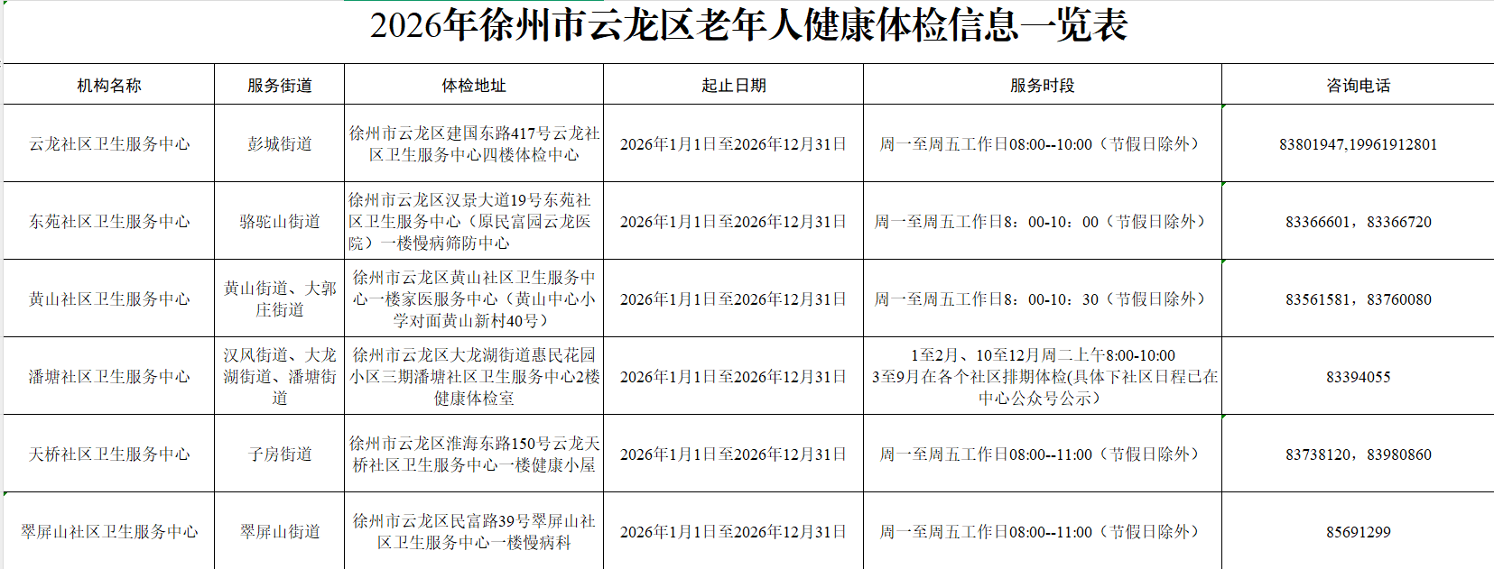 全程导医网 徐州健康信息:按照国家基本公共卫生服务项目要求,为进一步提升老年人健康水平,云龙区各社区卫生服务中心将为辖区内65岁及以上常住居民,每年提供一次免费的健康管理服务。