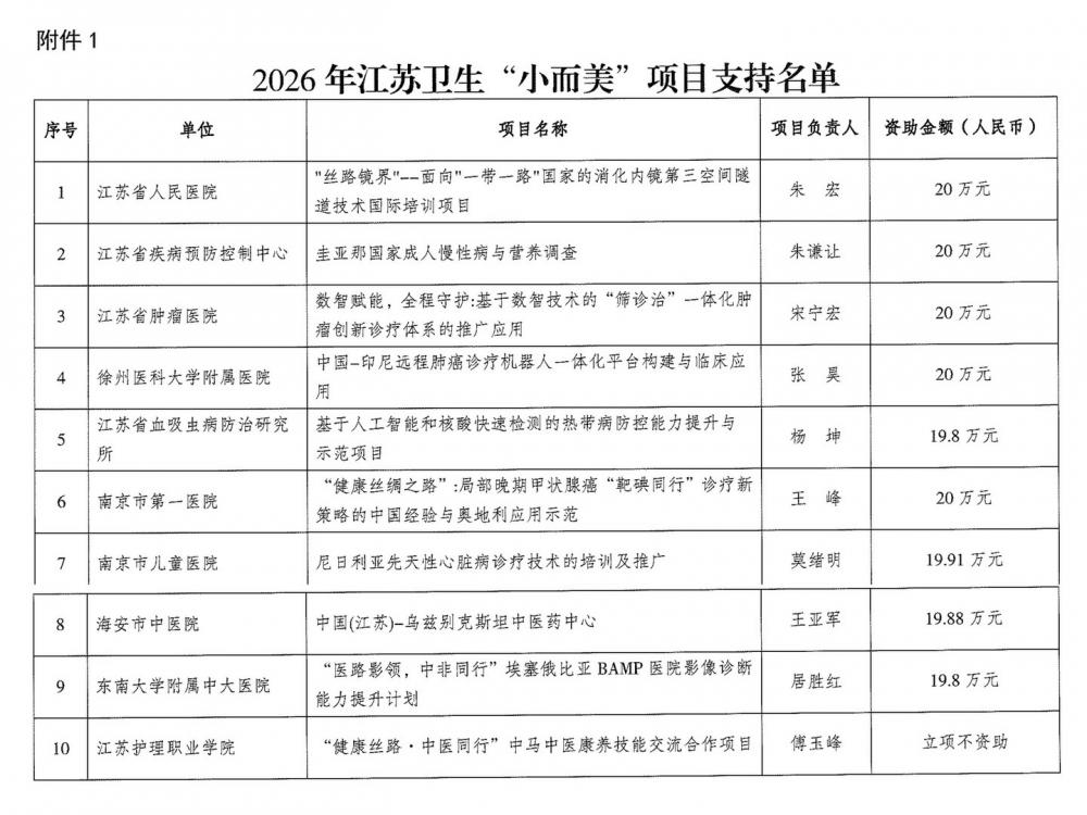 全程导医网 徐州健康信息:4月7日,省卫生健康委公布2026年江苏卫生“小而美”项目评审结果,徐医附院胸外科张昊教授牵头申报的《中国-印尼远程肺癌诊疗机器人一体化平台构建与临床应用》项目成功获批立项。