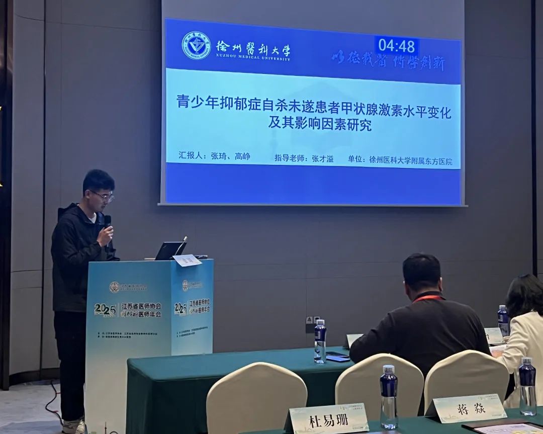 全程导医网 徐州心理频道:2025年4月18日-20日,江苏省医师协会精神科医师年会在常州召开。会议期间,徐州市东方人民医院张才溢教授课题组成员、精神医学硕士生张琦的论文《青少年抑郁障碍患者甲状腺激素水平与自杀未遂的关系及其影响因素研究》荣获青年医师优秀论文“三等奖”。