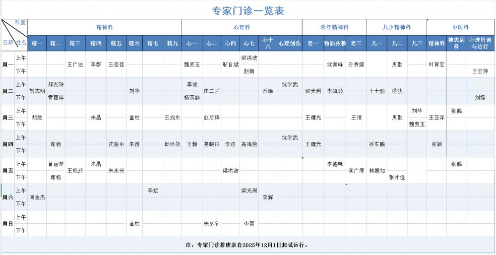 全程导医网 徐州精神卫生频道:徐州市东方人民医院2025年12月份专家门诊排班表、专病门诊排班表、心理咨询门诊排班表出炉啦!请您分享给有就医需求的患者朋友们!