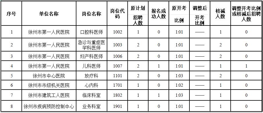 根据《2025年徐州市事业单位公开招聘医务人员(第二批)公告》“报名结束后达不到开考比例的岗位,原则上相应核减招聘计划,直至取消该岗位。对未达到开考比例的紧缺、急需岗位,经徐州市人力资源和社会保障局核准后,可适当降低开考比例,并在公告发布网址上进行公布”的规定,结合报名实际情况,经招聘单位及我委研究决定: