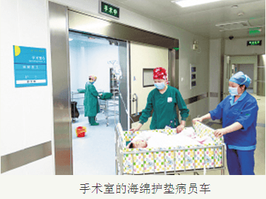 接送患儿的小推车上还有一个不易发现的细节——车子四周护栏上都加盖了一层海绵护垫。护士们加班加点,用海绵垫和小花布缝制成舒适和美观的护垫,用系带系于护栏上,这样不仅使小推车看起来更加美观,重要的是可以增加小患儿在转运途中的保暖性,而且还能防止途中患儿因躁动而引起的意外伤害。
