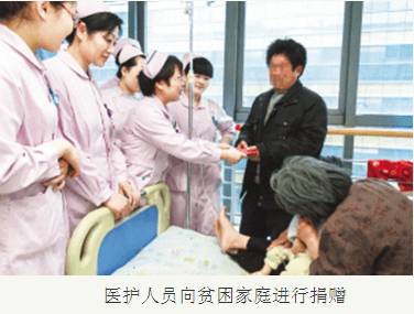 几年前,有一个特困家庭的孩子在市儿童医院住院,家里借钱买了一辆儿童车,偏偏不慎弄丢,母亲急得直落泪。医院的医护人员自发行动起来,集资为这个特殊的家庭买了一辆崭新的推车,孩子的父母感激不已。在日常工作中,这样的例子时有发生:几乎每个病区的医护人员都曾自发为经济困难的住院患儿赠送过衣物,平时护士们去食堂买饭时,常会帮一些独自带孩子的家长捎带饭菜,或者用自己的饭卡给经济困难的家庭买饭……点点滴滴的爱心,涌动在这所医院的每一个角落,时时温暖人心。