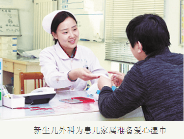 在新生儿外科的抢救室,入住的患儿都需要家长配合办理相关入室手续,核对患儿信息无误后,需要家长配合在相关文件上摁手印。细心的护士们发现,按完手印后,有的家长会将手指一直伸着,生怕印油弄脏衣服;有的家长会用自己带的纸巾擦一下手,但经常擦不干净,留有蓝色的印记;有的可能迫于孩子生病而焦急不已,或者忙于别的事情,干脆直接擦在了自己的衣服上……这些小小的细节被护士们看在眼里,于是大家集思广益,决定准备一包爱心湿巾,下面放一个纸篓,家长摁完手印后,护士会抽出湿巾,请家长擦一擦手上的蓝印油,再扔进纸篓里。一张小小的湿巾,为焦急、无措的家长提供了无声的关怀,在细节中体现出人性化,在关爱中温暖人心。