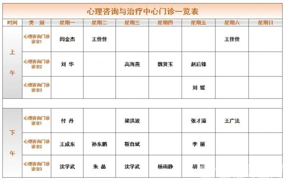 2023年8月心理咨询与治疗中心门诊一览表