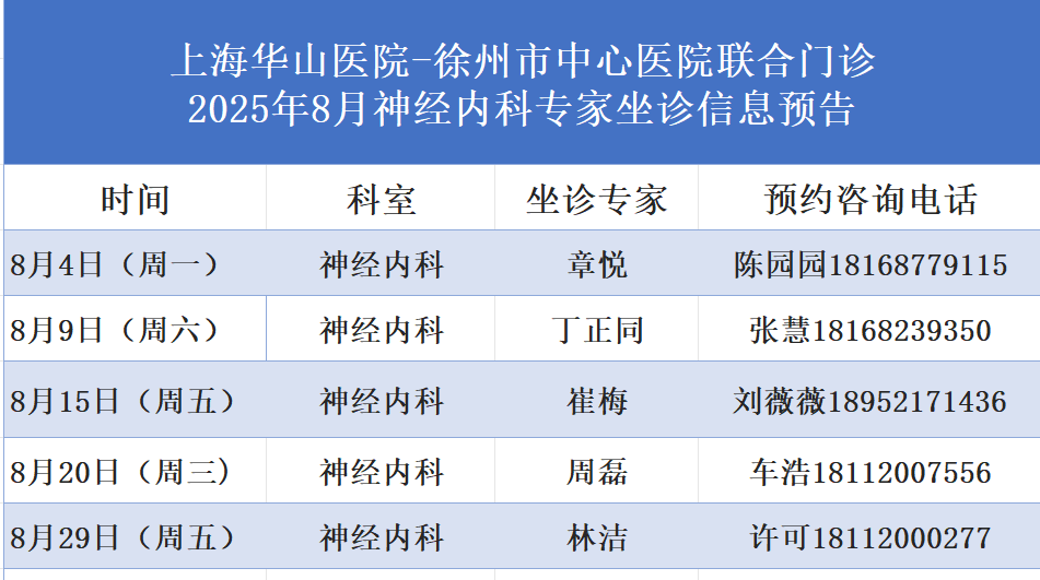 全程导医网 徐州就医信息:8月份,上海华山医院神经内科专家章悦、丁正同、崔梅、周磊、林洁将坐诊徐州市中心医院“上海华山医院-徐州市中心医院联合门诊”,具体信息如下: