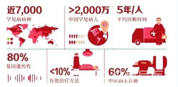 通过一组数据可能更容易帮助观众们直观了解它:世界卫生组织(WHO)数据统计,罕见病种多达7000种,全球约有4亿罕见病患者,我国罕见病患者数亦多达2千万,因此在庞大人口基数的前提下,我们的罕见病并不“罕见”。这些罕见病患者从出现症状到确诊可能需要辗转四五家医院、平均历经4-5年时间才能得以确诊,因为很多患者缺乏典型症状,且80%以上的罕见病是由遗传因素导致的,医疗机构需要具备一定的诊疗水平。而确诊的患者中仅有不到10%的患者可以得到有效救治,剩下90%患者处于无药可医的情况。还有一半以上的患者因为经济、医疗条件、信息源等原因无法得到及时的正确的诊断。