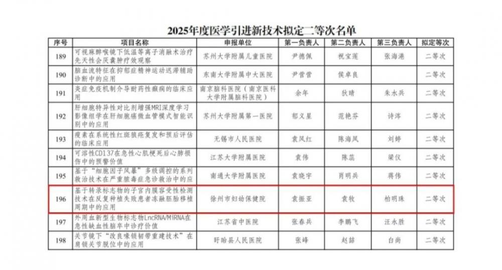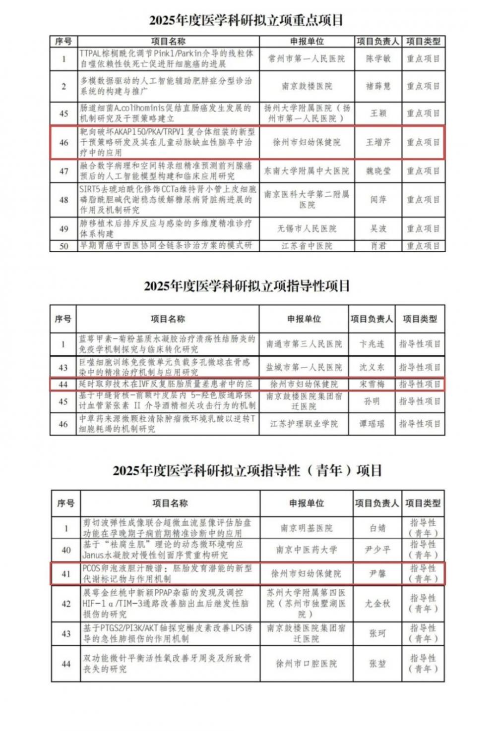 全程导医网 徐州妇幼保健频道:近日,江苏省卫生健康委员会发布《关于2025年度医学科研拟立项项目和医学引进新技术评估拟确定等次名单的公示》,徐州市妇幼保健院在此次科研项目申报和医学引进新技术评估中迈上新台阶,展现了徐州市妇幼保健院在妇幼健康科研领域的持续深耕与扎实积累。提交的3个科研项目全部通过专家评审,成功入选拟立项名单,实现申报“全中”,更获批重点项目,实现了该类项目“零的突破”。在全市29项省卫生健康委拟立项医学科研项目中,以3项拟立项的优异成绩位居前列。同时公示的还有省卫生健康委医学引进新技术拟定二等次1项。