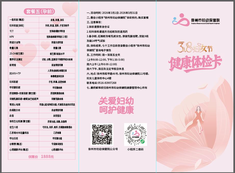流程:关注“徐州市妇幼保健院”微信小程序→体检服务→体检预约→预约个人体检→选择体检套餐。