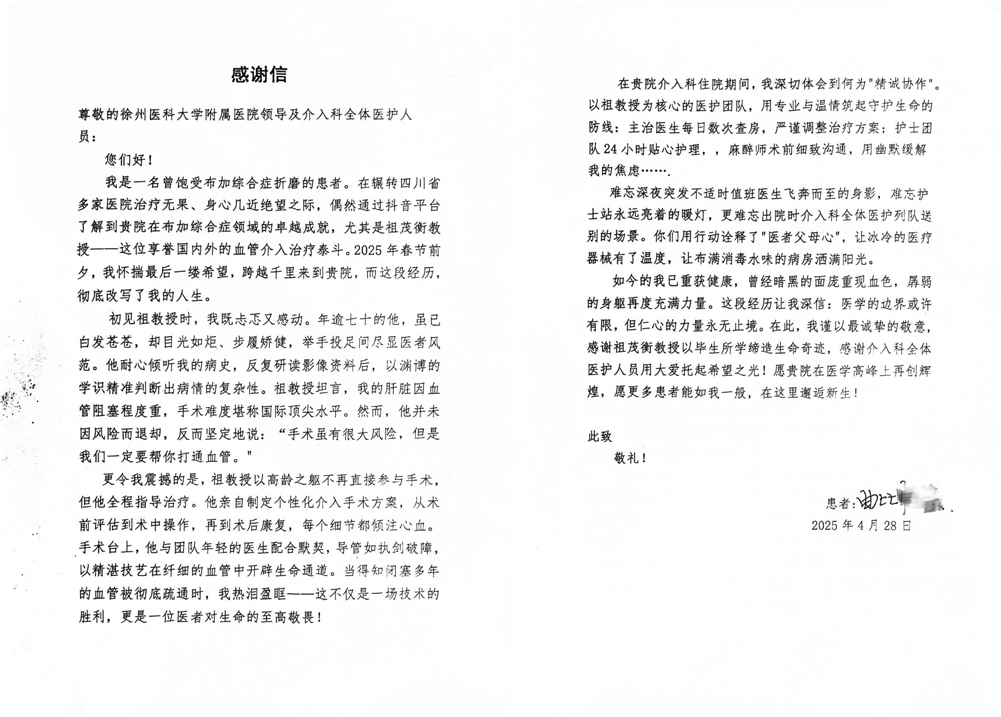 全程导医网 徐州健康信息:2025年5月7日下午,四川省的曲比先生携妻子来到徐医附院行风建设办公室送上一封《感谢信》,表达对介入放射科祖茂衡教授以精湛医术让他重获健康的感恩之情,谨向祖茂衡教授和介入放射科医护团队致以最衷心的感谢。