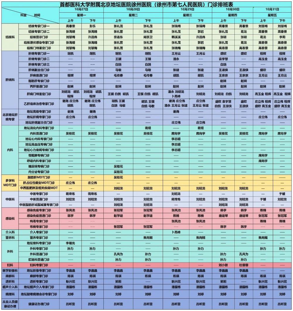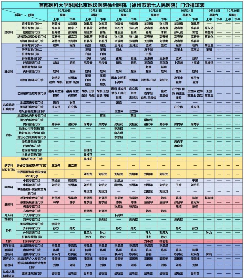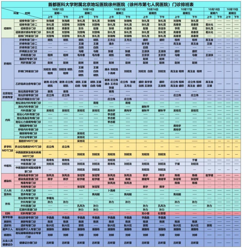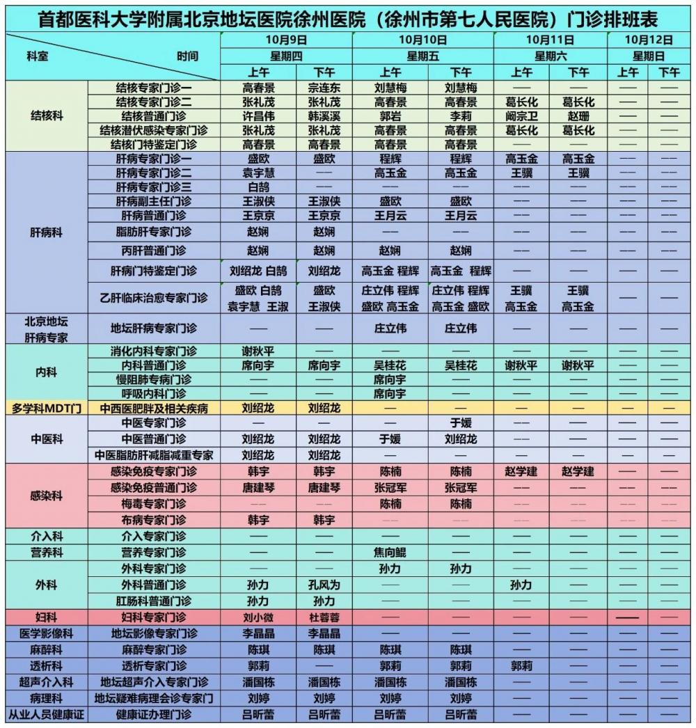 徐州市第七人民医院门诊坐诊信息一览表(10月9日-10月31日)