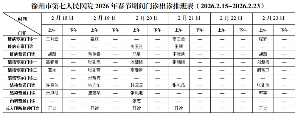 全程导医网 徐州传染频道:根据国家相关规定,结合医院的具体情况,经医院研究决定,徐州市第七人民医院春节假期安排如下: