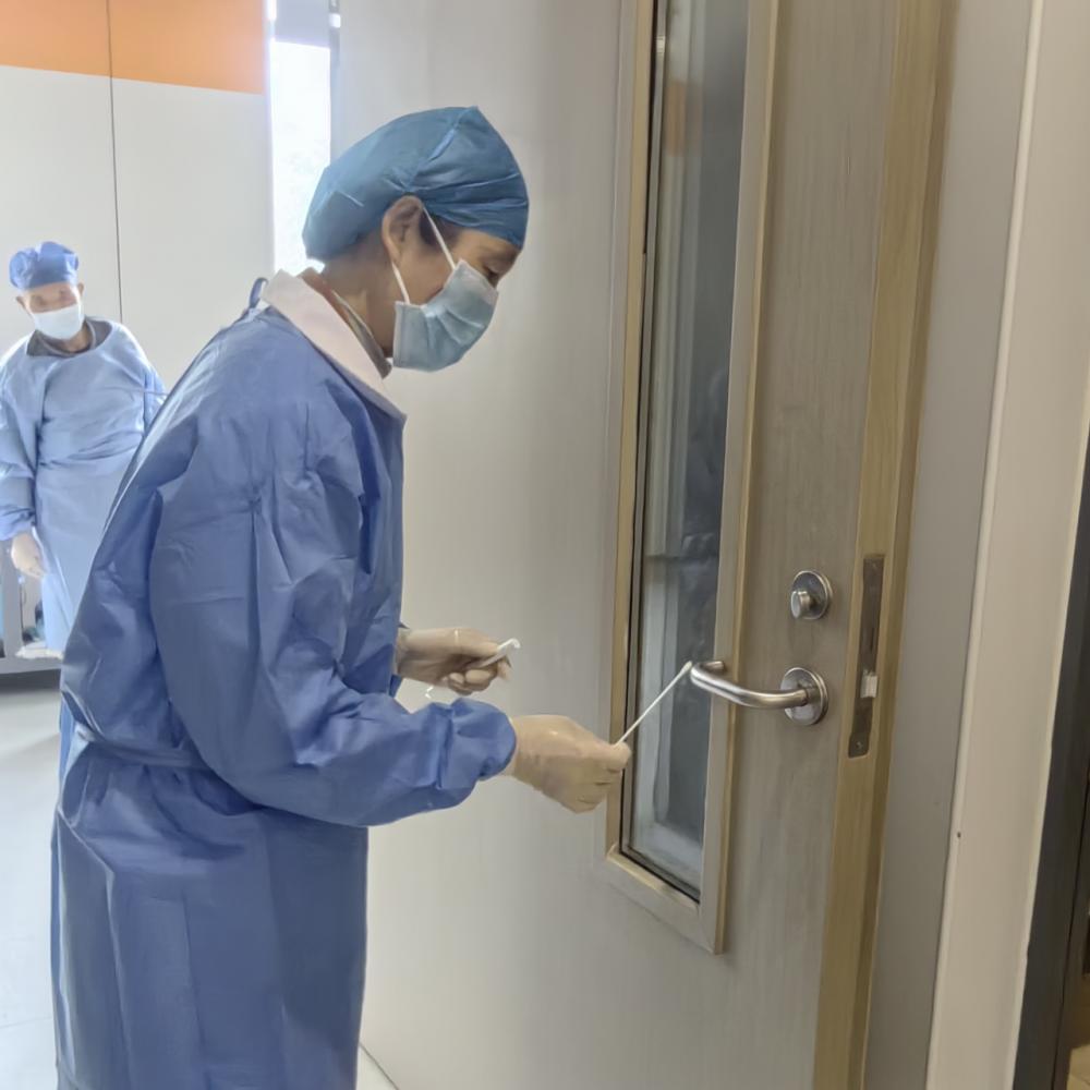 · 规范采样与精准流调:院感专职人员进入内外科病区,对消毒前工作人员手、保洁员手、病房床头桌、门把手、等环境物体表面等进行采样。公共卫生科工作人员协同内外科工作人员展开流行病学调查,迅速锁定感染源及传播途径。