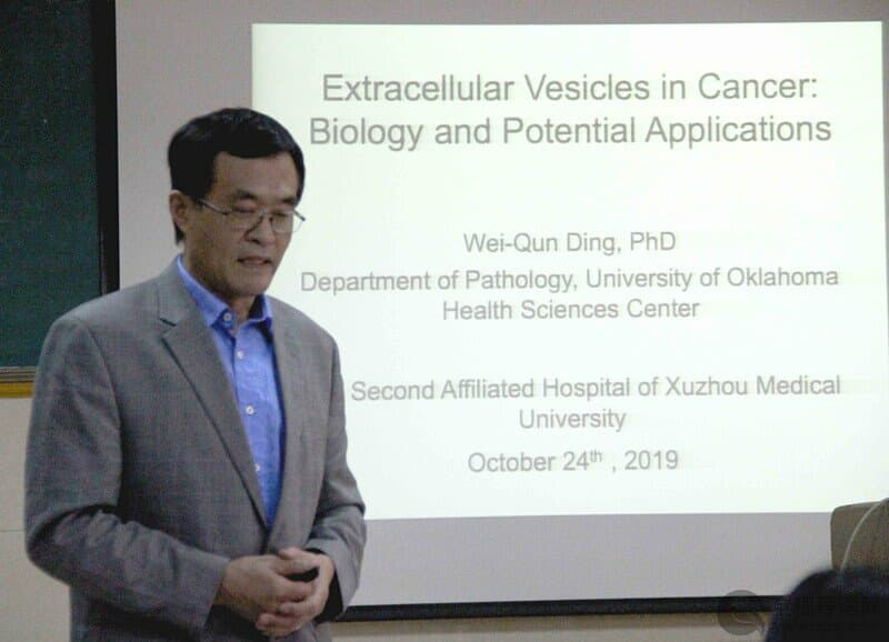 全程导医网 徐矿总医院频道:金秋十月,美国俄克拉荷马大学终身教授丁卫群受邀访问徐矿总医院,与肿瘤科同仁们就“外泌体在肿瘤中的作用”等方面展开广泛的讨论和经验分享。交流报告会由科教科副主任张清秀主持,徐矿总医院部分医师、研究生和进修医生30余参与交流。