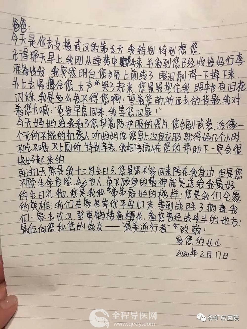 “您是我和弟弟最好的榜样!,您是我们全家的英雄!我们在家里等你平安回来。等到战胜了病毒,我们一家去武汉的黄鹤楼看樱花,看您曾经战斗的地方!”