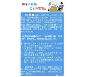 一般80%的患儿发病后首先出现呕吐,起病8-12小时排出果酱样大便或血与黏液混合的胶冻样大便。如果两段肠管套入的时间过长,就会出现肠坏死、肠穿孔、肠粘连等严重疾病,甚至危及生命。